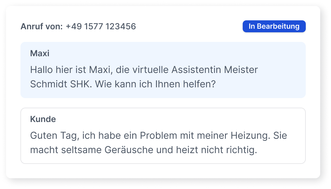 Maxi nimmt alle eingehenden Anrufe zuverlässig und professionell entgegen – auch wenn du und dein Team gerade bei einem Einsatz beim Kunden seid oder das Büro nicht besetzt ist.